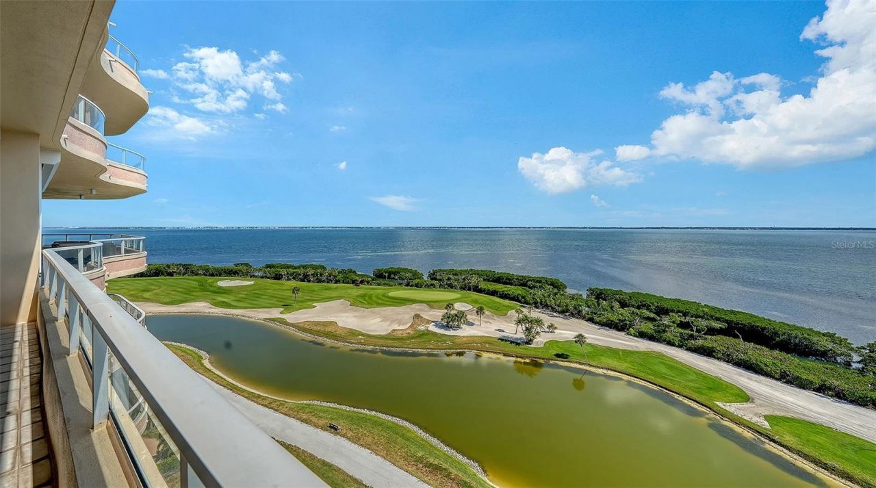 Welcome to Grand Bay. Experience the essence of refined coastal living, where breathtaking panoramic water and city views take center stage. Awaken to the sunrise over Sarasota Bay's skyline with limitless views of the bay and golf course, and unwind with stunning sunsets over the Gulf, an ever-changing display of beauty from every room. Perfectly situated on the 8th floor, this elegant home welcomes you through a private-access, controlled elevator leading to a stunning foyer framed by contemporary glass double doors. The Cayman open floor plan immediately reveals sweeping vistas, while large porcelain tile flooring flows seamlessly through the living areas and onto two outdoor terraces ideal for quiet relaxation. The stunning updated kitchen features two-toned cabinetry, Wolf and Sub-Zero appliances, under-cabinet lighting, quartz countertops, and an inviting breakfast bar. An adjacent eat-in area with floor-to-ceiling sliders opens to a private covered terrace, a perfect setting for entertaining guests and boundless vistas. The primary suite is a lavish retreat, complete with white oak floors, two walk-in closets and a spa-inspired bath showcasing, a soaking tub, glass shower, and dual vanities. The guest suite offers private terrace access for stunning sunset views, complemented by white oak floors and an en-suite bath. Discover versatility with a den/office that doubles as an occasional guest room, providing privacy with elegant pocket doors that separate it from the formal dining room, and a 3rd full bath just steps away. A well thought out conversion has added a built-in office area adding functionality to round out the interior. Residents enjoy various first-rate amenities, including 24-hour guard gates, a clubhouse, two community pools and spas, a large fitness center with saunas, and tennis courts. Stroll the neighborhood's scenic walking paths or enjoy deeded access to the exclusive gated Bay Isles Beach Club offering locker rooms, barbecues, volleyball nets, covered picnic areas and a sandy white beach. Located behind the Bay Isles secure gates, this secluded neighborhood rests on the rolling greens of the Longboat Key Club's golf course. Grand Bay residents find it hard to leave this special community. This residence truly captures the best refined Bay and beach lifestyle - sophisticated, exclusive, and ready to be enjoyed.