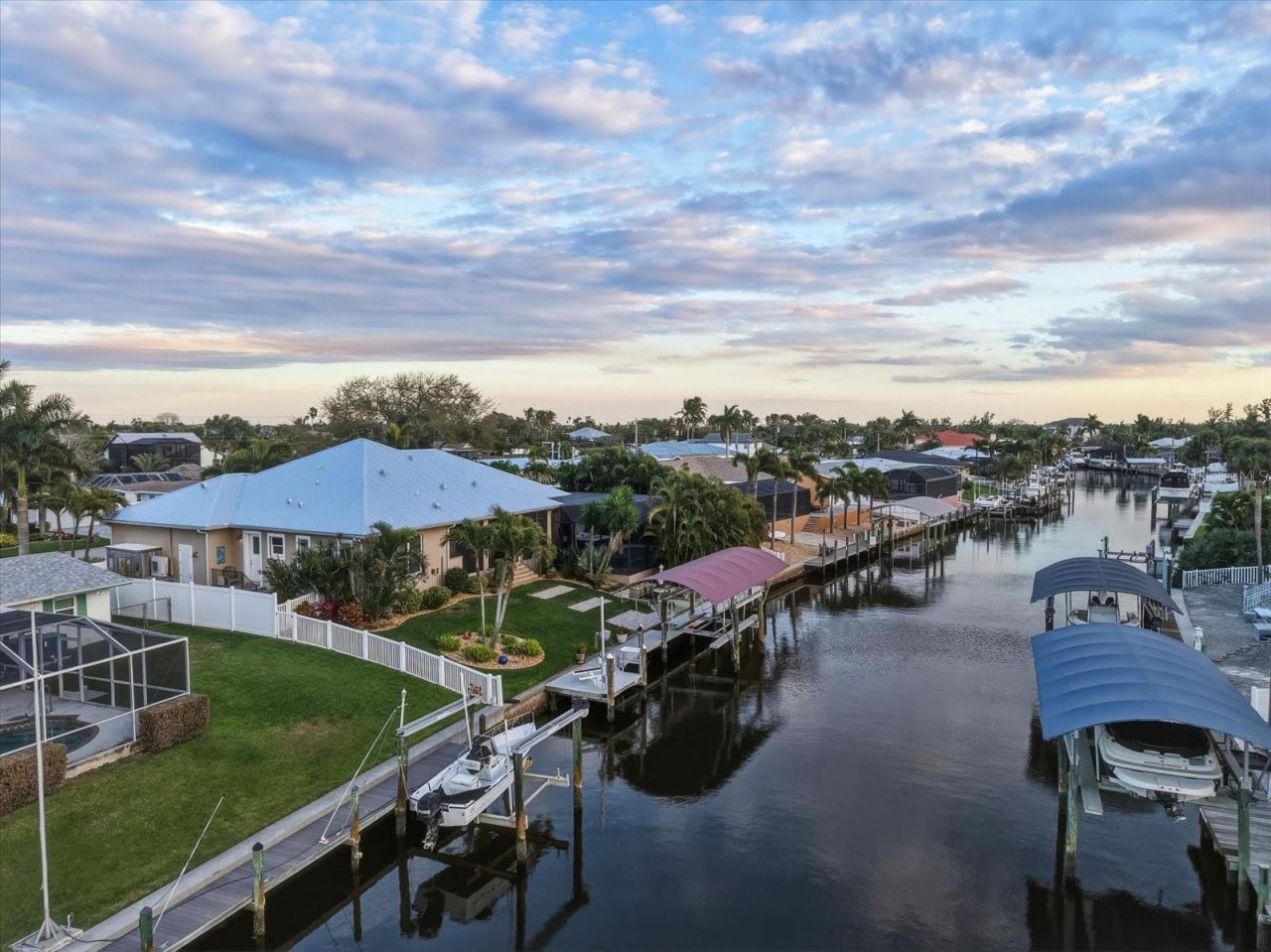 Waterfront living reaches its finest expression at 4916 Coral Blvd-where custom craftsmanship, an oversized waterfront homesite, and a covered 13,000 lb boat lift create a residence designed for the ultimate Florida boating lifestyle. Built in 2015, this custom waterfront estate blends timeless coastal elegance with the strength and efficiency of modern construction including a New metal roof. A wide paver driveway, lush tropical landscaping, swaying palms, and a striking metal roof set the tone on arrival, offering both architectural presence and enduring durability. Inside, a sophisticated open-concept floor plan unfolds with effortless flow between the main living, dining, and entertaining spaces. Expansive windows invite natural light throughout the home while framing tranquil water views. Custom cabinetry found throughout the residence reflects exceptional attention to detail and craftsmanship, while a gas fireplace anchors the living room with warmth and refined character. The thoughtfully designed layout provides both comfort and privacy, featuring three spacious bedrooms, each with its own beautifully appointed en-suite bath-creating a private retreat for family and guests alike. The primary suite offers a serene sanctuary complete with a generous walk-in closet and a luxurious bath designed for relaxation. A private den provides a versatile space ideal for a home office, library, or quiet lounge. Outdoors, the home transforms into a private waterfront resort. A large pool and hot tub are surrounded by mature tropical landscaping that creates a remarkable sense of privacy-an ideal setting for both peaceful afternoons and elegant entertaining. The outdoor kitchen extends the living experience beyond the walls of the home, allowing gatherings to flow seamlessly between indoor and outdoor spaces. For boating enthusiasts, the private dock is equipped with a covered 13,000 lb boat lift, offering protection for your vessel and effortless access to the open waters of the Gulf-perfect for sunset cruises, fishing excursions, or exploring the nearby barrier islands. Welcome home where every detail has been curated to deliver a lifestyle defined by waterfront luxury, privacy, and effortless coastal living.
