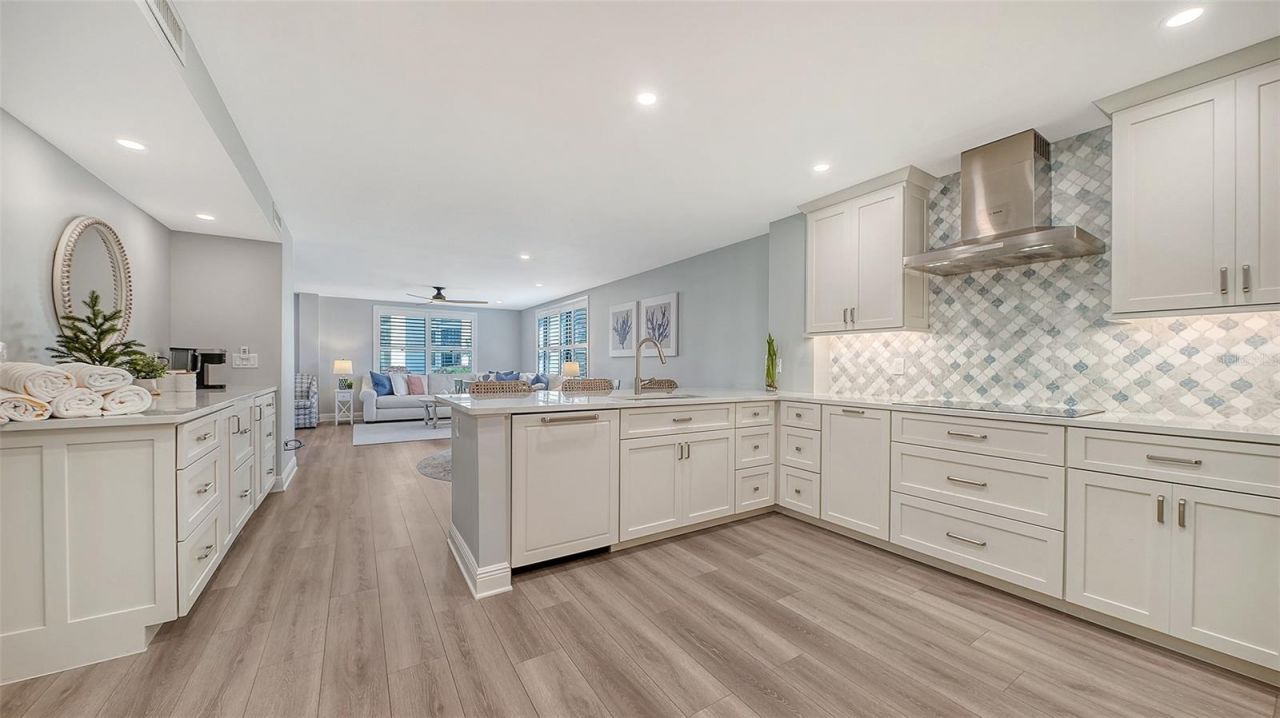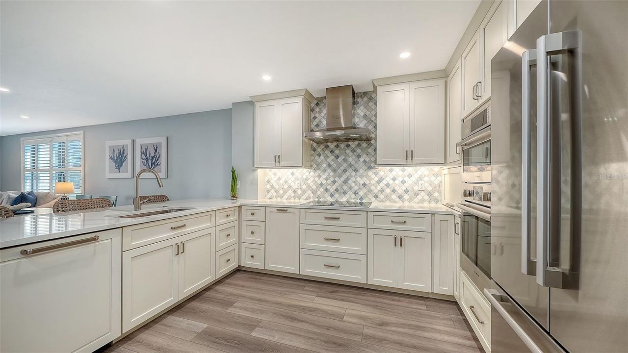 Welcome to the effortless rhythm of island living at Gulf & Bay Club, one of Siesta Key's most prestigious beachfront communities. Behind the 24-hour guard-gated entrance, this beautifully remodeled, rarely available, three-bedroom residence offers the perfect blend of comfort, privacy, and resort-style living in a setting that feels worlds away from the everyday.Positioned on the first floor as a bright end unit, the home is surrounded by windows on three sides, filling the interior with natural light and creating a relaxed coastal atmosphere throughout. The thoughtfully redesigned floor plan opens beautifully for entertaining, with elegant finishes and carefully curated upgrades that make the residence feel both sophisticated and welcoming. The kitchen was designed with gathering in mind, featuring custom cabinetry, quartz countertops, marble backsplash, and premium Bosch appliances including induction cooktop and stainless vent hood. An additional built-in entertaining area with beverage refrigeration and extra storage makes hosting friends and family effortless. Living and dining areas flow naturally to the private lanai overlooking tropical landscaping and a tranquil lagoon, just steps to one of the community's three pools, where evenings are often spent enjoying the peaceful surroundings and the soft glow of Siesta Key sunsets. The three-bedroom layout provides exceptional flexibility, whether for hosting guests, accommodating family, or creating a quiet home office. The primary suite offers a peaceful retreat with a walk-in closet and a beautifully updated bath featuring custom cabinetry, quartz countertops, and an expanded designer-tiled shower. Extensive renovations throughout the home include raised ceilings, smooth-finish walls, luxury flooring, updated lighting and electrical systems, new ductwork, upgraded panel box, air handler, and quick-recovery water heater. Importantly, the residence did not experience water intrusion during the recent hurricanes, offering additional peace of mind. Life at Gulf & Bay Club is defined by its resort-style amenities across 32 gated beachfront acres and 800 feet of Siesta Key's famous quartz sand beach. Residents enjoy three heated pools including a lap pool, tennis and pickleball courts, racquetball, a large fitness center, beautifully landscaped walking paths surrounding the freshwater lagoon, clubhouses for gatherings, electric vehicle charging stations, and professional on-site management - all within a secure 24-hour guard-gated community. Just beyond the gates, the vibrant charm of Siesta Key Village awaits with its locally loved restaurants, boutiques, and island nightlife, while downtown Sarasota's renowned arts and cultural scene is only a short drive away. This is more than a residence - it is an opportunity to experience the best of beachfront living on Siesta Key.