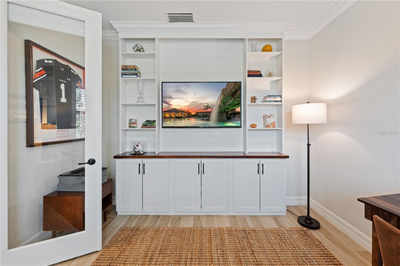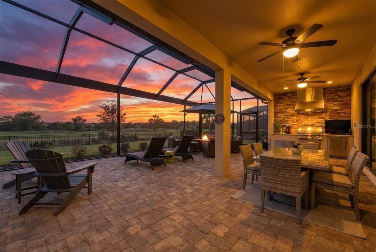 Enjoy expansive golf course views and spectacular western sunsets from this beautifully upgraded Victoria model in one of Lakewood Ranch's most sought-after deeded golf communities, Lakewood National Golf Club. From the moment you arrive, the home offers inviting curb appeal with a widened paver driveway expanded approximately 18 inches on each side, tile roof, impact-rated windows, mature tropical landscaping, and a side-yard easement providing additional space between neighboring homes. Inside, the open-concept layout features tile plank flooring throughout the main living areas, tray ceilings with crown molding, designer lighting, and a spacious great room that flows seamlessly into the kitchen and dining areas. The kitchen showcases white cabinetry, granite countertops, stainless steel appliances, and a spacious center island with seating that anchors the open living space, perfect for everyday living and entertaining. The adjacent dining space is highlighted by a designer chandelier, creating a welcoming setting for gatherings. A custom beverage bar with wine refrigerator and glass shelving adds a stylish touch, while the great room is highlighted by a designer feature wall with shelving. The primary suite offers golf course views, tray ceiling, walk-in closet, and an en-suite bath with dual vanities, soaking tub, walk-in shower, and a private water closet. A private den with glass French doors and custom built-ins provides flexible space for a home office or media room. The guest bedroom with plantation shutters is located near a full guest bathroom, offering comfortable accommodations and privacy for visitors. Step outside to the extended 35' x 25' screened lanai with paver deck and upgraded panoramic screen enclosure, designed for true Florida indoor-outdoor living. This impressive space includes multiple seating and dining areas and a fully equipped outdoor kitchen with grill, vent hood, and beverage refrigerator. The panoramic screen enclosure maximizes expansive golf course views and spectacular western sunsets, creating a perfect setting for relaxing or entertaining. A convenient lanai half bath provides easy access for outdoor gatherings, and the outdoor space offers room to add a pool, if desired. Additional highlights include custom electric shades in the living room and primary bedroom, plantation shutters, epoxy garage flooring with overhead storage racks, designer lighting, and thoughtful finishes throughout. Golf membership conveys with ownership. Lakewood National Golf Club is the only deeded golf community in Lakewood Ranch where ownership for all residents includes access to two Arnold Palmer-designed 18-hole championship courses, one of which hosts the annual Korn Ferry Tour event. Residents enjoy a beach-entry heated lagoon pool with waterfalls and lap lanes, six satellite pools, tiki bar, Grand Clubhouse dining, state-of-the-art fitness center with studios and trainer, spa services, Har-Tru tennis courts, pickleball, bocce, practice facilities, scenic trails, and a vibrant community calendar. Completed in 2022, the community is fully established and professionally managed with 24-hour guard-gated entry and roaming security. An exceptional opportunity to enjoy the Lakewood National lifestyle.